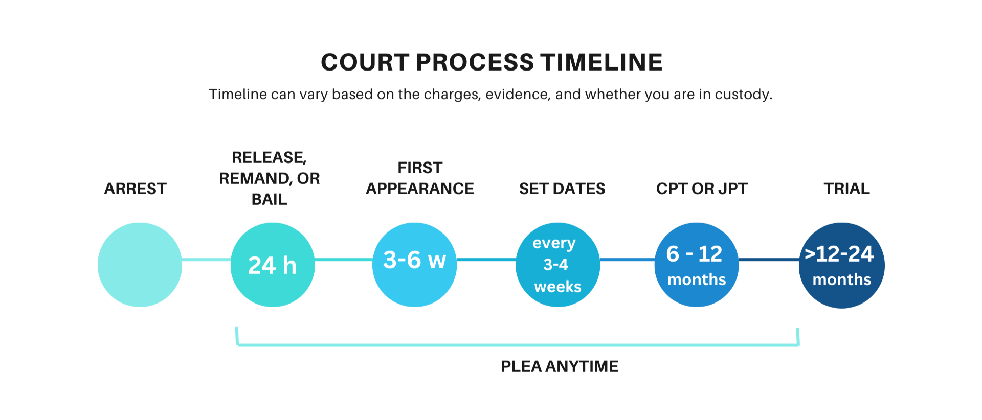 Whether you are facing charges while detained in jail or released on bail, the court dates and case progression are similar. The following is a brief plain-language breakdown of what each step is.